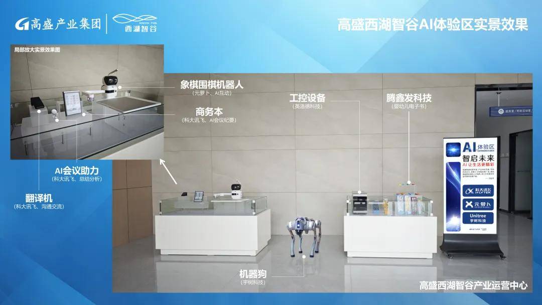 高盛西湖智谷在产业运营中心打造AI体验区,目前已设置了科大讯飞商务本、AI翻译机、AI商务助手,元萝卜围棋机器人以及宇树科技机器狗等前沿科技产品,这些产品不仅展示了人工智能技术和高科技技术在不同领域的应用,还为参观者提供了生动有趣的互动体验。